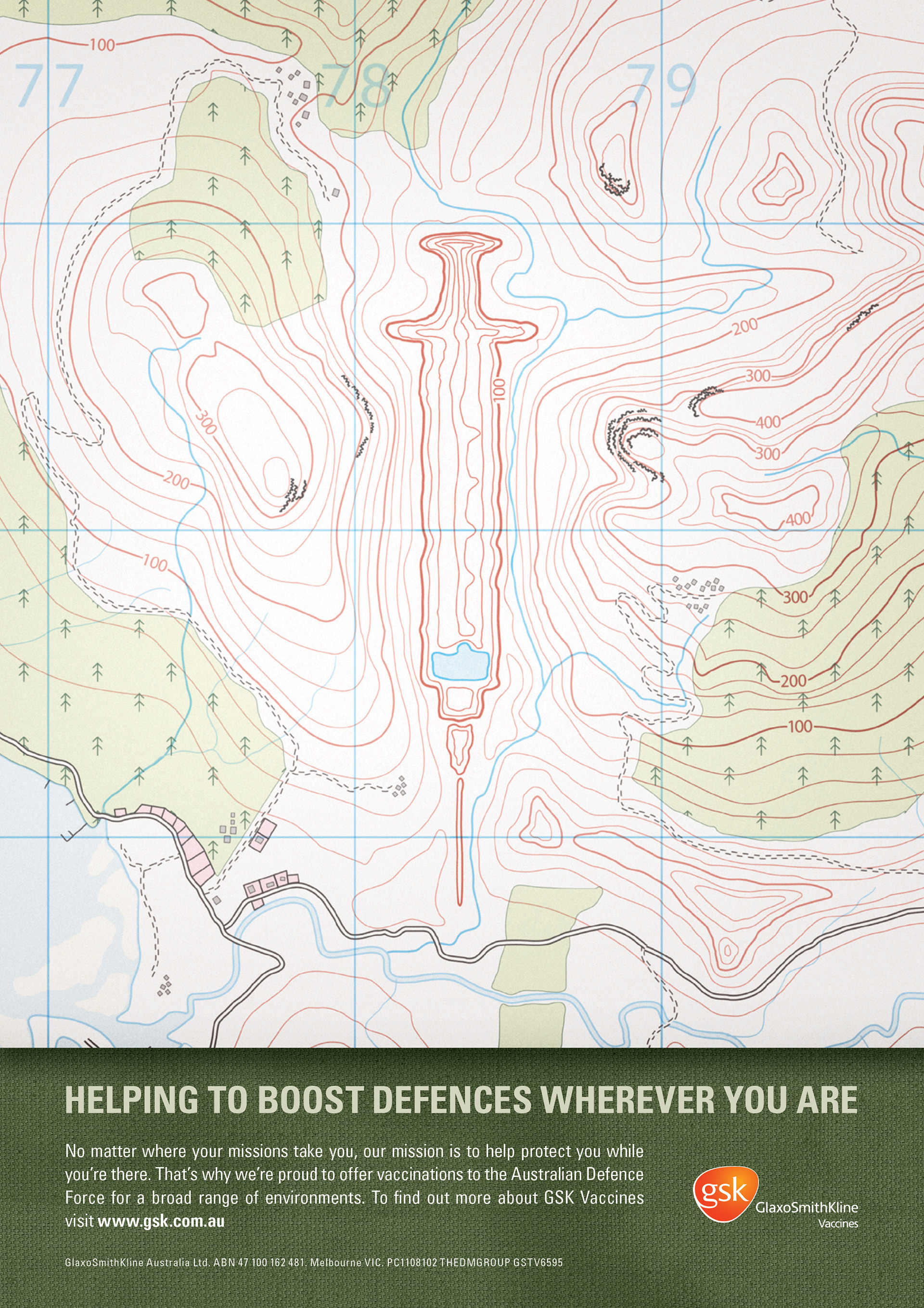 GSK Vaccines asked us to produce a full page press ad to publicise its support in vaccinating our armed forces both here and overseas. The simple image of a hyperdermic built into the contours of an ordnance survey map perfectly illustrated the idea that GSK has our men covered wherever they go. And it soon had GSK taking orders. COPYWRITER - Pru Oxford ILLUSTRATOR - Ross Goddard